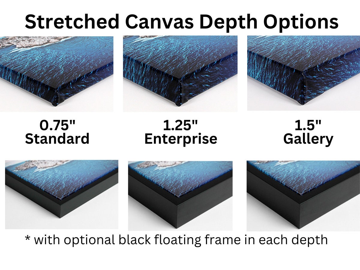Available in multiple sizes, and 3 different stretched canvas wood frame depths (0.75", 1.25", and 1.5"). Each canvas is printed with highly accurate colors onto a thick archival grade canvas made of a poly-cotton blend. Each canvas is PH neutral and acid free so it will not yellow over time. The canvas is then hand stretched over a kiln dried pine frame that will not bow or warp. We mirror the edge of the image so the original image is not lost. The canvas and frame uses only the best quality materials (no pressed cardboard, plastic, or particle board like most other canvas printers use).