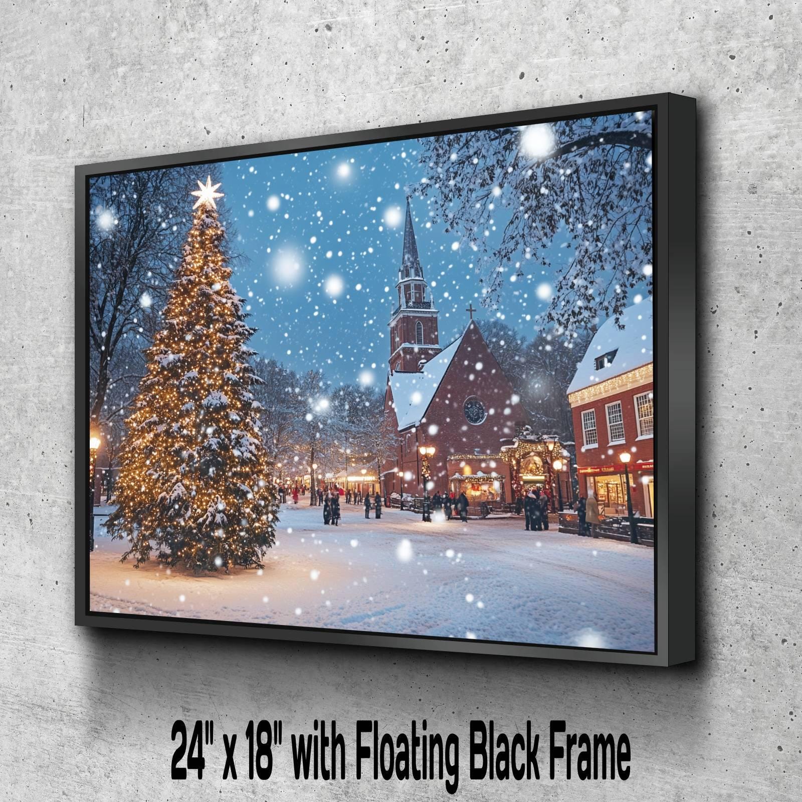 Christmas Tree Town Square Print | Snowy Church Holiday Wall Art | Festive Winter Village Scene | Xmas Lights Snow Painting | Holiday Decor
