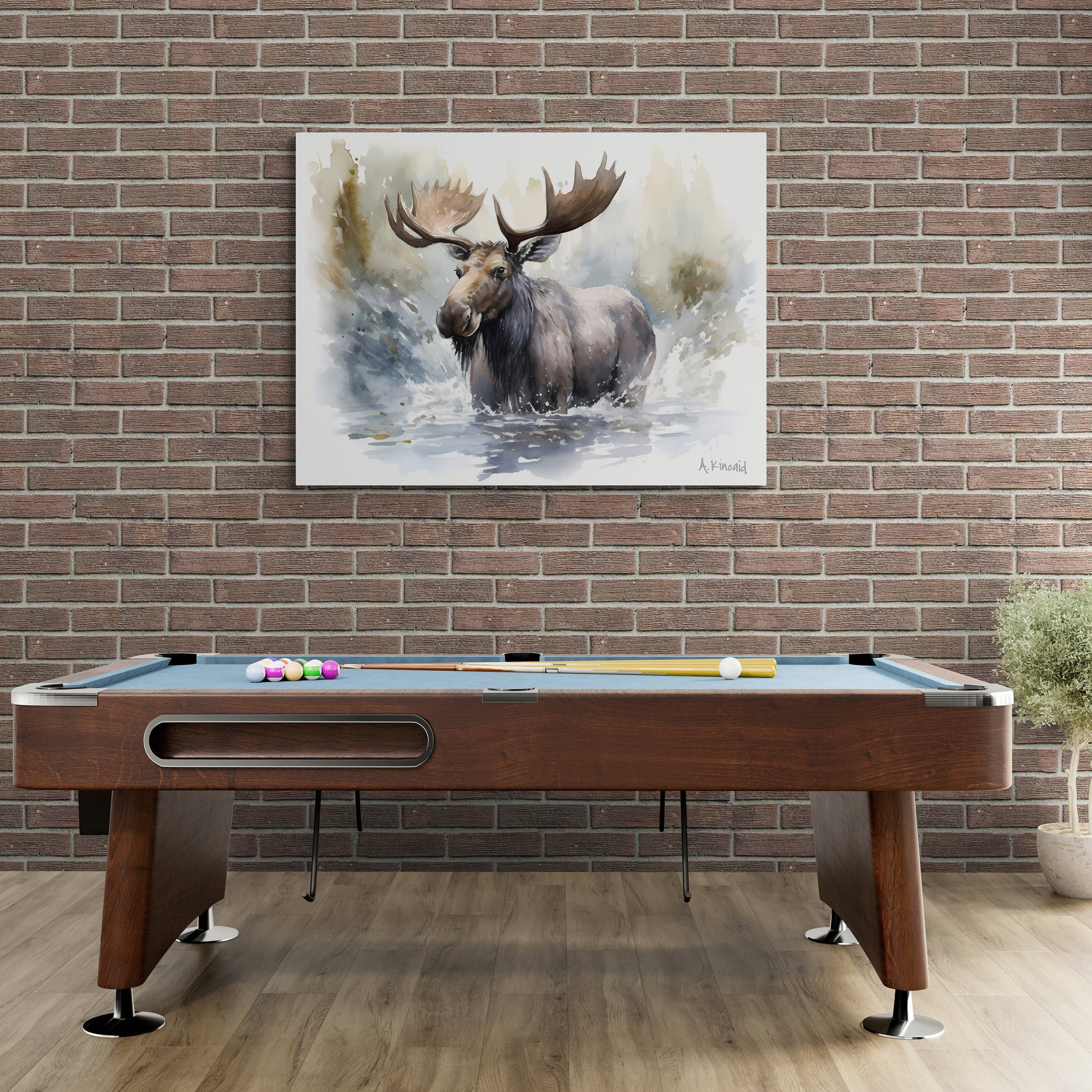 ""Moose in River #1" is perfect for art enthusiasts who appreciate the beauty of nature and seek to bring a touch of wilderness into their living spaces. Whether displayed in a living room, study, or bedroom, this artwork will add a captivating focal point that sparks conversations and ignites the imagination.