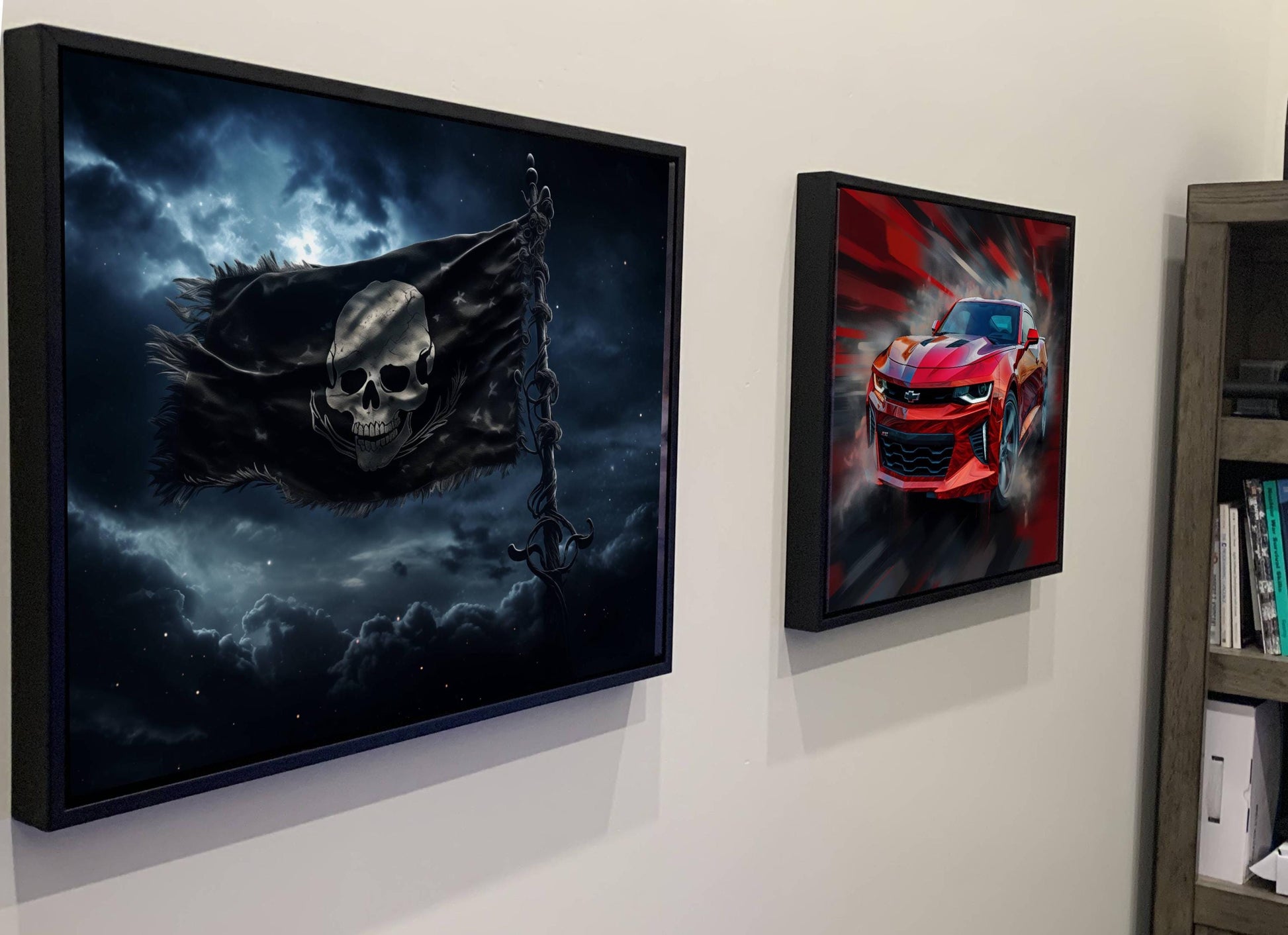 A floating frame is available as option that can set your canvas artwork off and garner more attention for it. Floater frames give art the illusion of floating inside the picture frame without touching it, which creates an interesting visual detail and a sense of three-dimensional depth in the overall display. For larger sizes (i.e. 40x40, 48x36, 60x30), the canvas area will be reduced slightly so the finished size with the frame will be the size ordered. This prevents the shipping cost from jumping to the next tier to prevent an unreasonable surcharge for shipping.