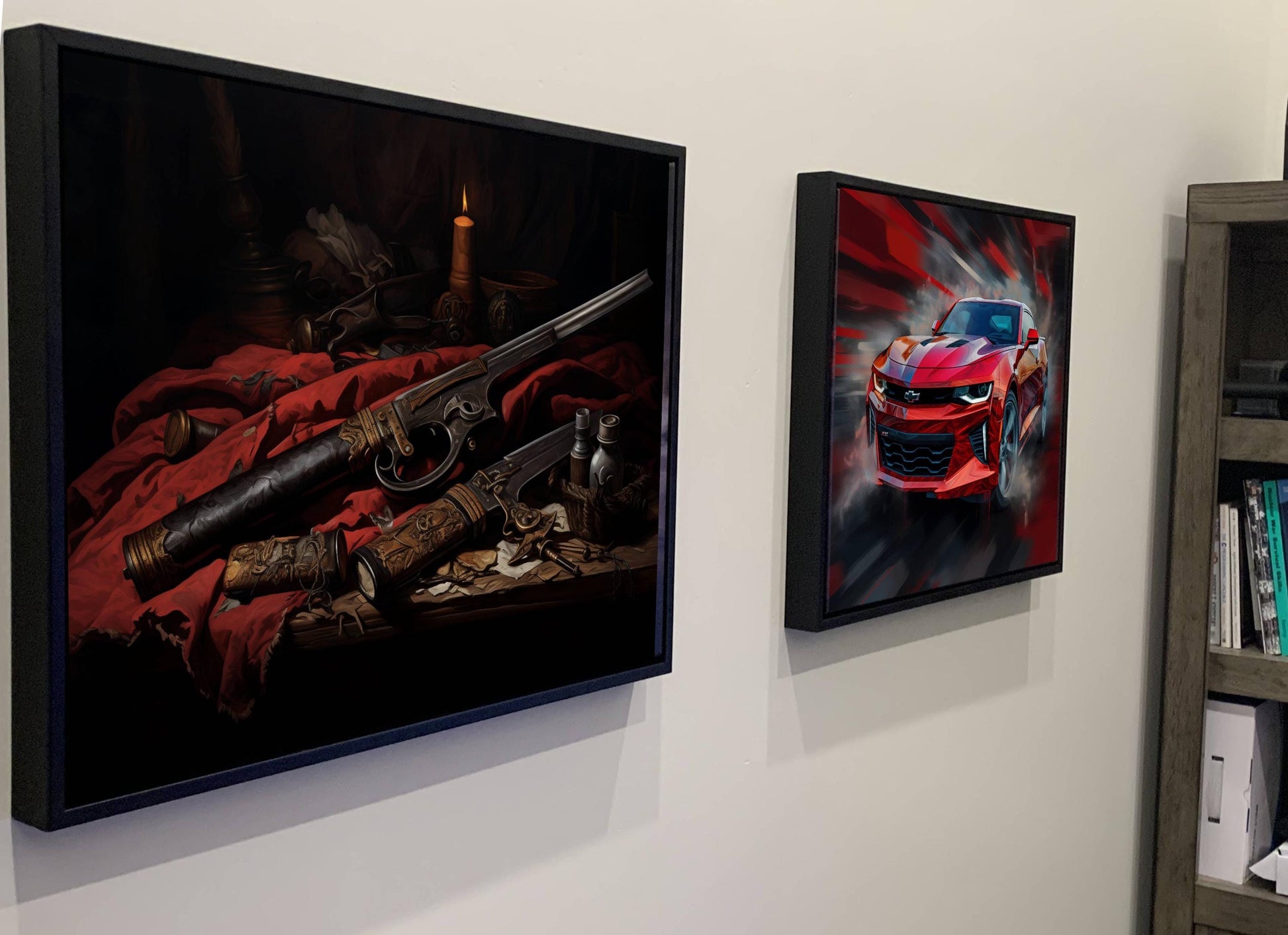This dramatic pirate weapons still life showcases ornately engraved antique flintlock pistols and an elaborate dagger arranged on rich red fabric with period details including candlelight, maps, and coins. The dark, atmospheric composition captures the authentic feel of the golden age of piracy with museum-quality weapon details and masterful lighting. Perfect for pirate enthusiasts, history collectors, or anyone seeking bold masculine wall art with vintage maritime weaponry and gothic ambiance.