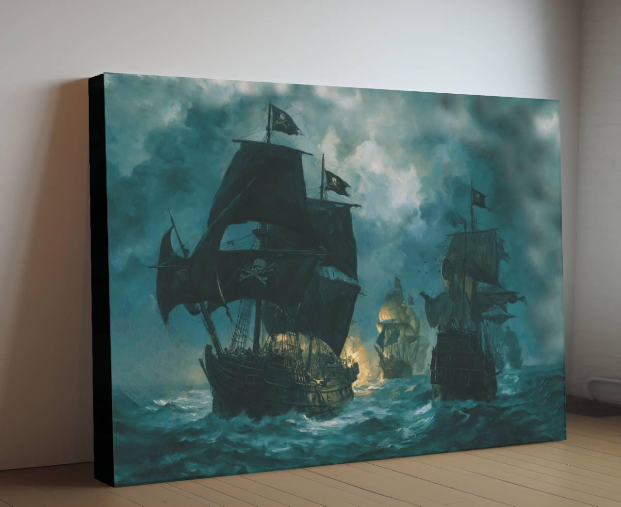 Pirate Naval Battle Canvas, Sea Warfare Ships Print, Jolly Roger Fleet Wall Decor, Burning Vessels Teal Ocean Painting