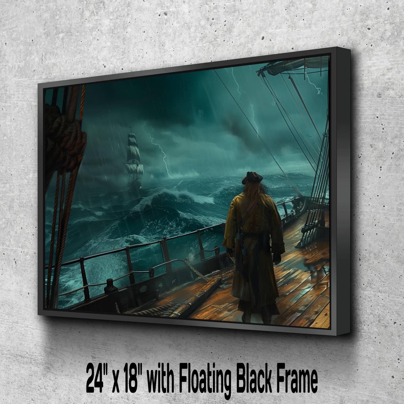 This dramatic pirate captain scene depicts a lone figure in a golden coat standing on the storm-battered deck watching another vessel through lightning-streaked teal skies and turbulent seas. The cinematic composition captures the solitary courage of maritime leadership during nature's fury, with incredible atmospheric detail in the rain-soaked deck, rope rigging, and ominous storm clouds. Perfect for adventure enthusiasts, leadership inspiration, or anyone seeking powerful nautical wall decor that celebrates the raw courage and determination of seafaring captains facing the ocean's might.