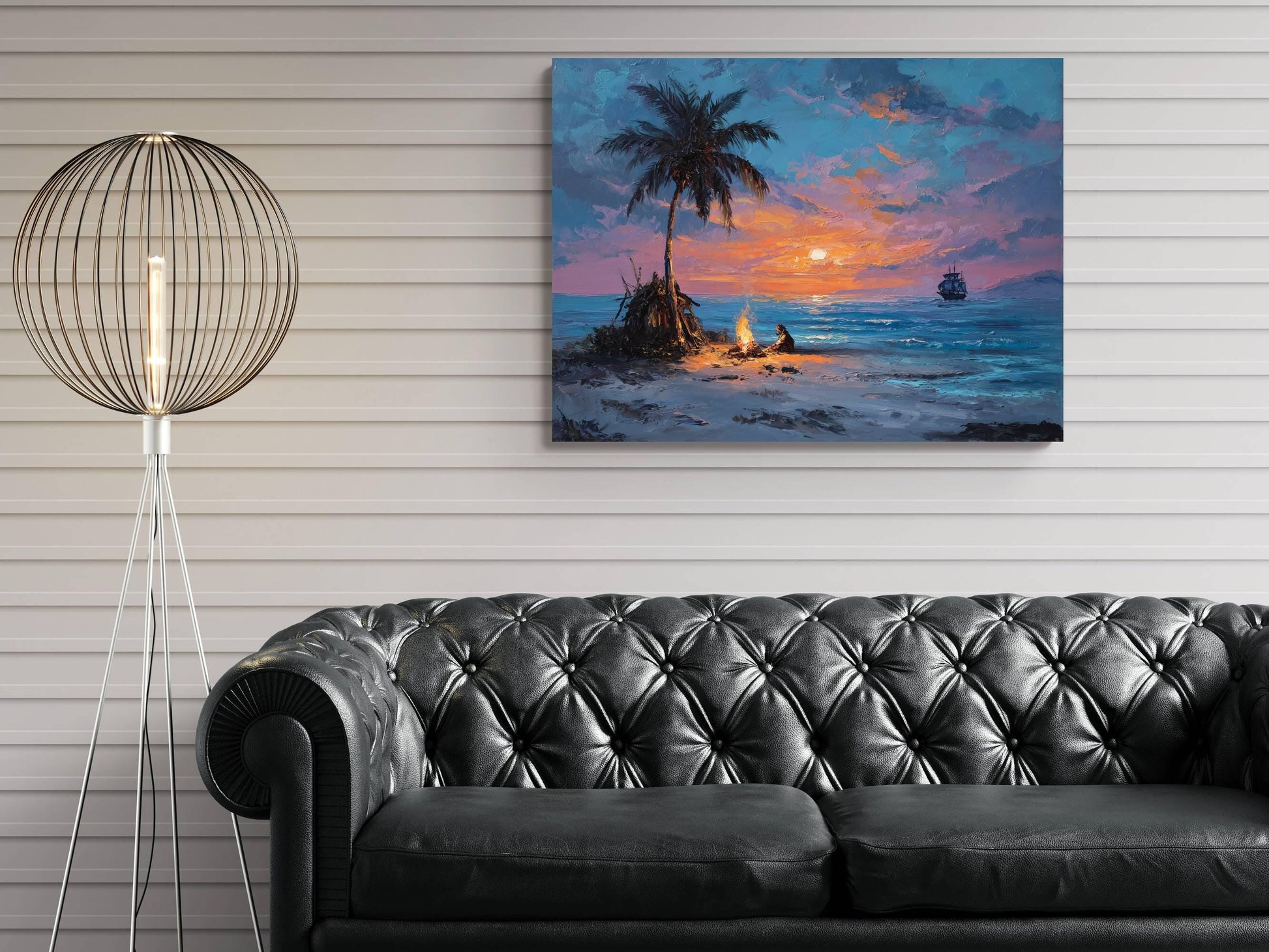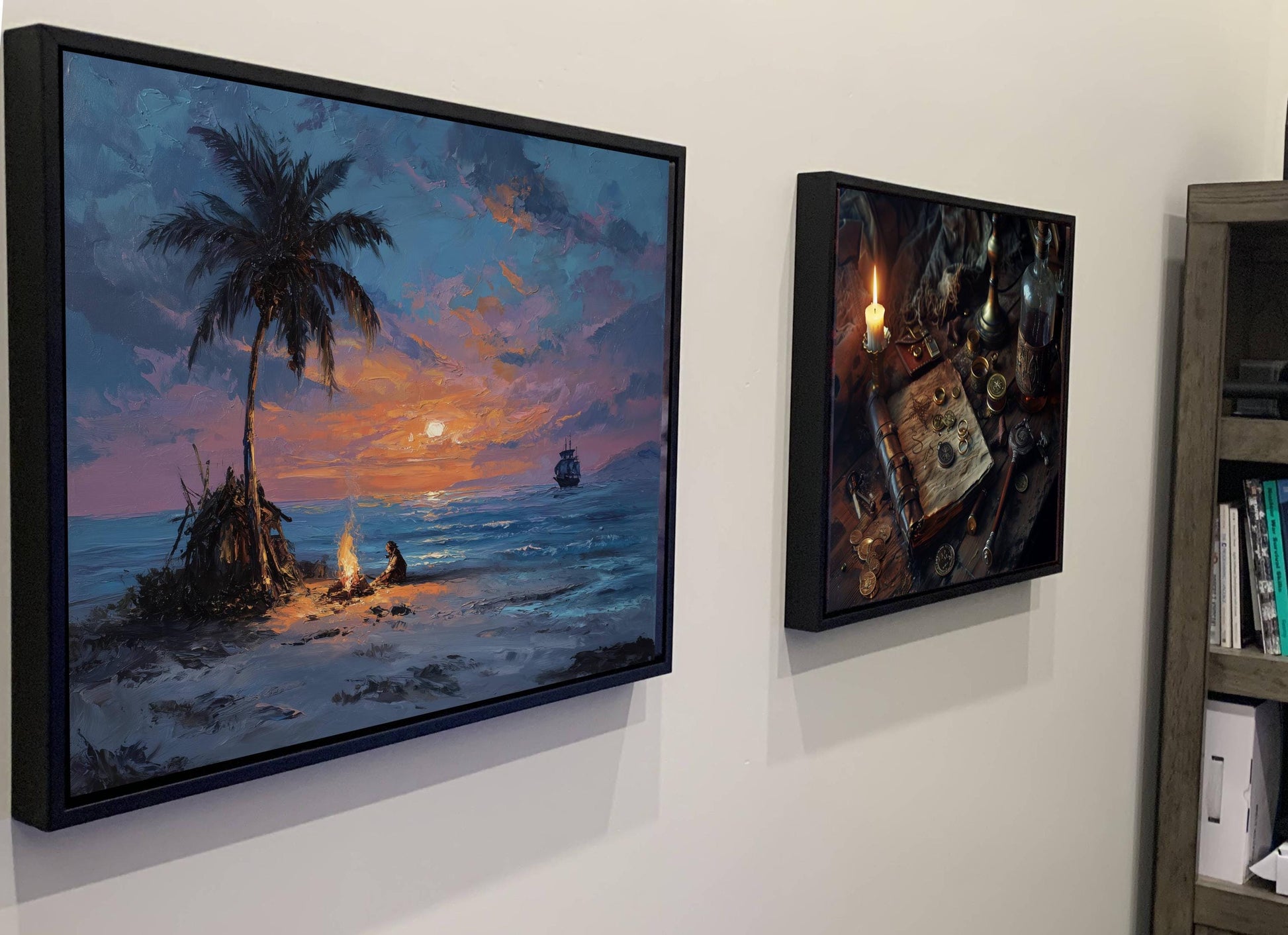 Pirate Castaway Island Canvas, Marooned Sailor Print, Deserted Beach Sunset Wall Decor, Signal Fire Oil Painting Style