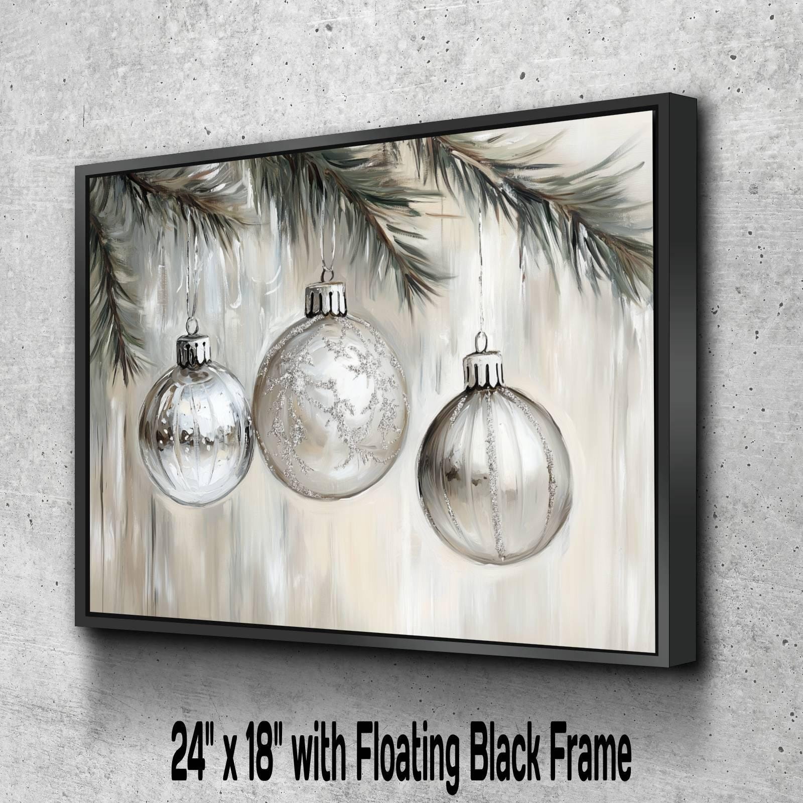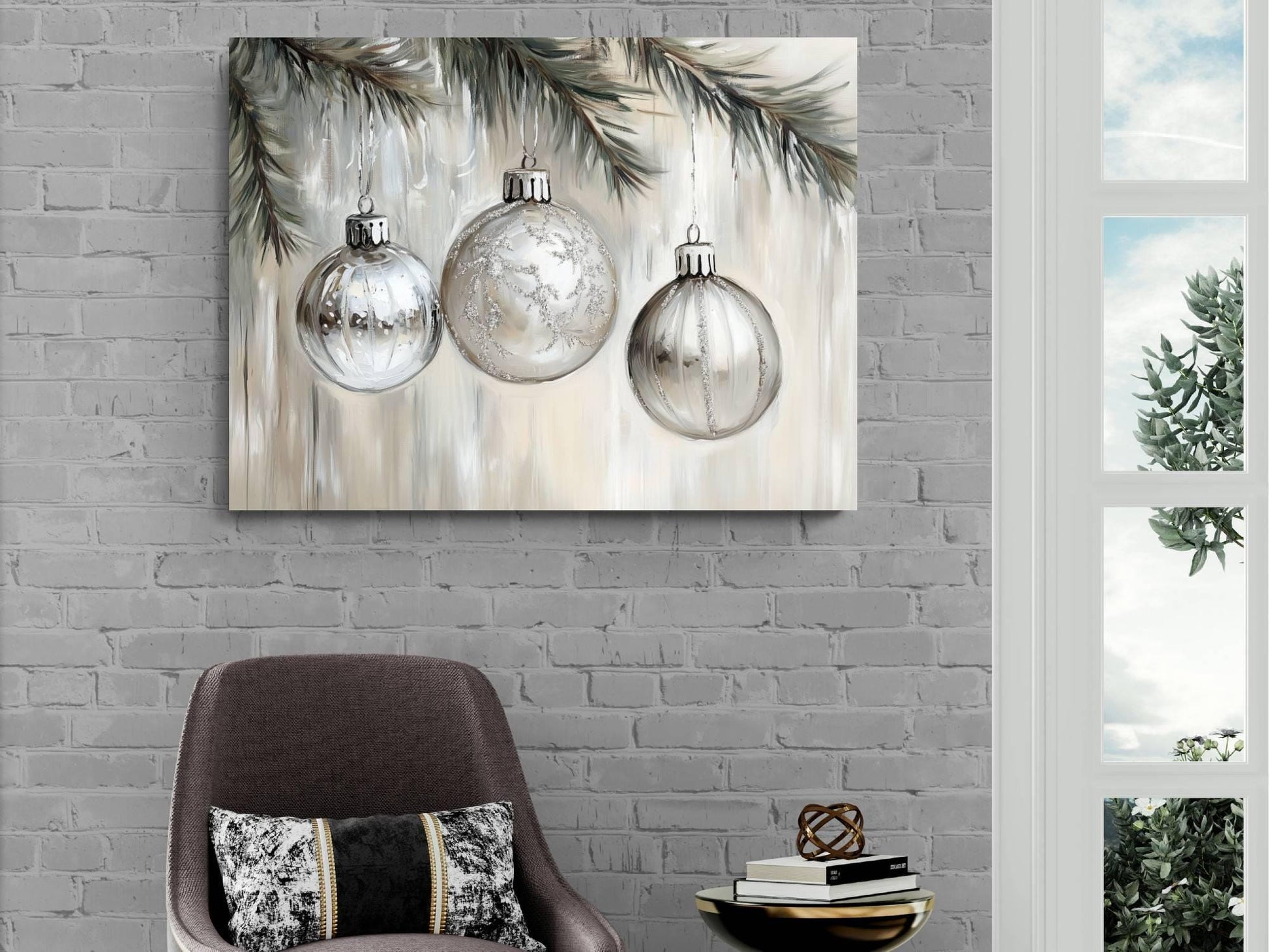 Silver Christmas Ornaments Print | Glass Baubles Evergreen Branch Art | Holiday Tree Decorations Wall Decor | Xmas Ornament Painting