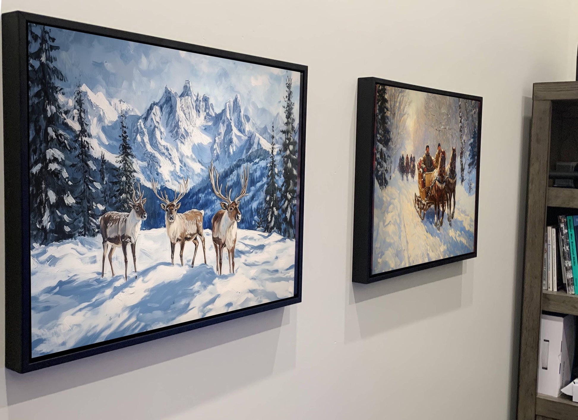 Winter Reindeer Art Print | Snowy Mountain Landscape Wall Decor | Christmas Caribou Nature Painting | Alpine Wildlife Scene | Xmas Animals